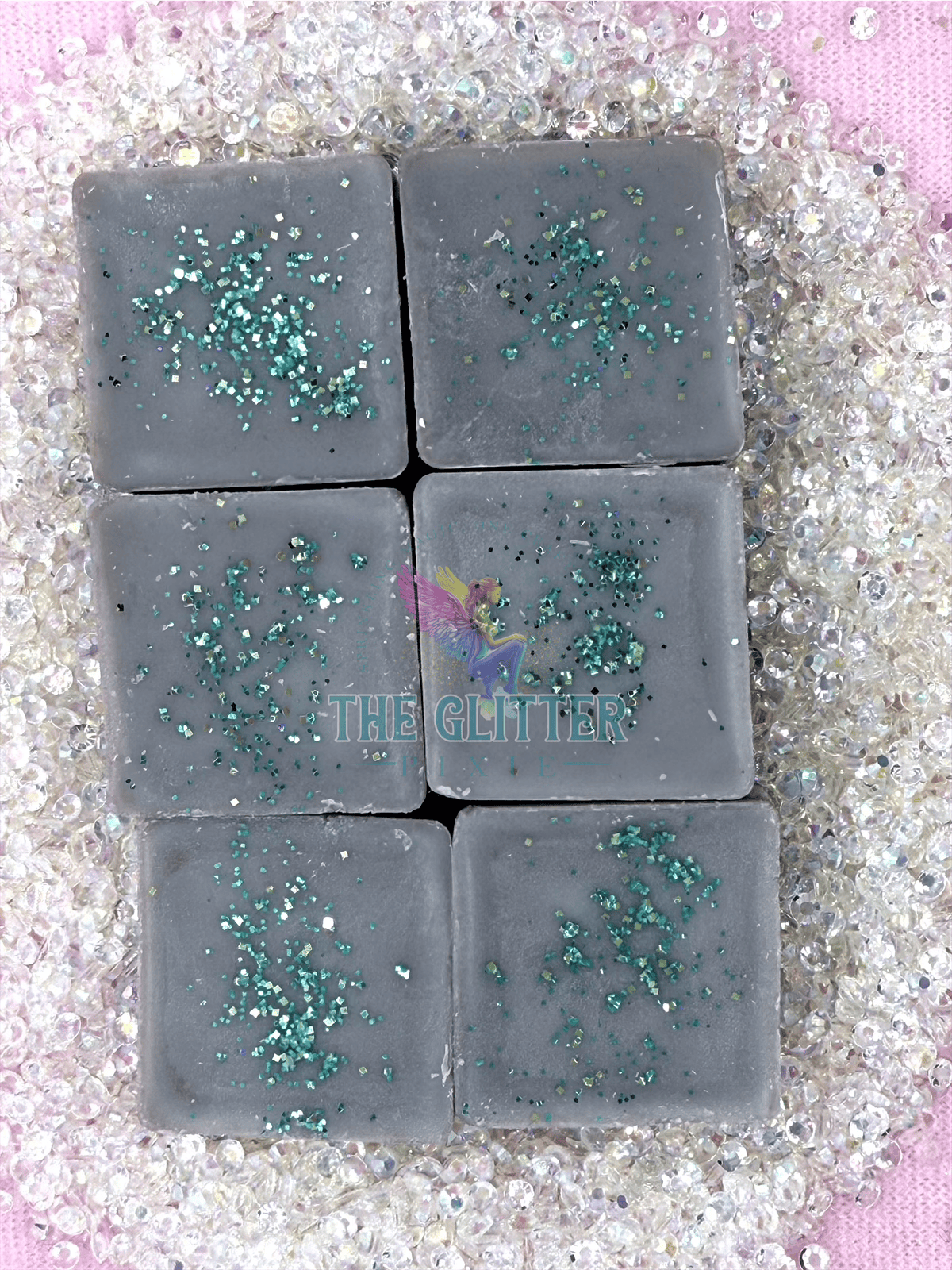 Handmade Starbucks Coffee soy wax melts. These have sparkly purple/grey mica for the shimmering effect and turquoise glitter. You get 6 pieces. The pieces are approximately 1" by 1" by 1/2" big. The weight of all 6 pieces is approximately 2.3 ounces.