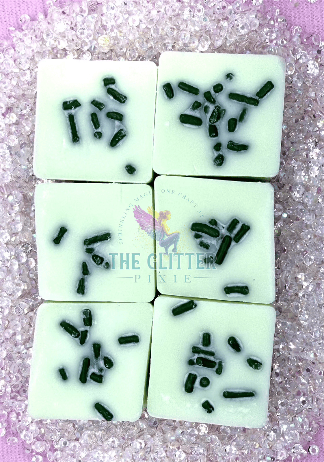 Handmade Eucalyptus and Spearmint soy wax melts. These have sparkly green mica for the shimmering effect and green sprinkles. You get 6 pieces. The pieces are approximately 1" by 1" by 1/2" big. The weight of all 6 pieces is approximately 2.3 ounces.