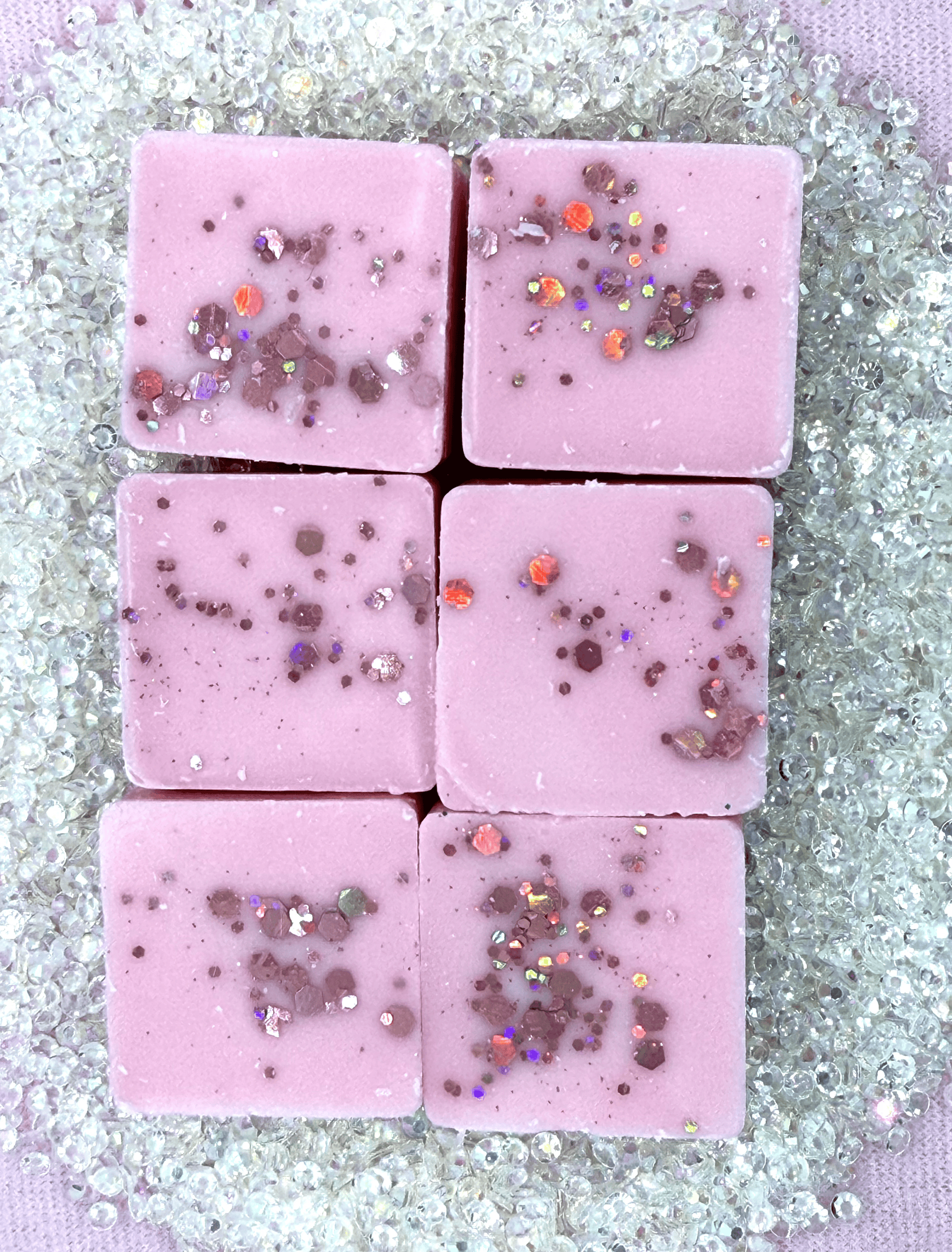 Handmade Pink Sands (Yankee Candle Type) soy wax melts. These have sparkly pink mica for the shimmering effect and rose gold glitter. You get 6 pieces. The pieces are approximately 1" by 1" by 1/2" big. The weight of all 6 pieces is approximately 2.3 ounces.