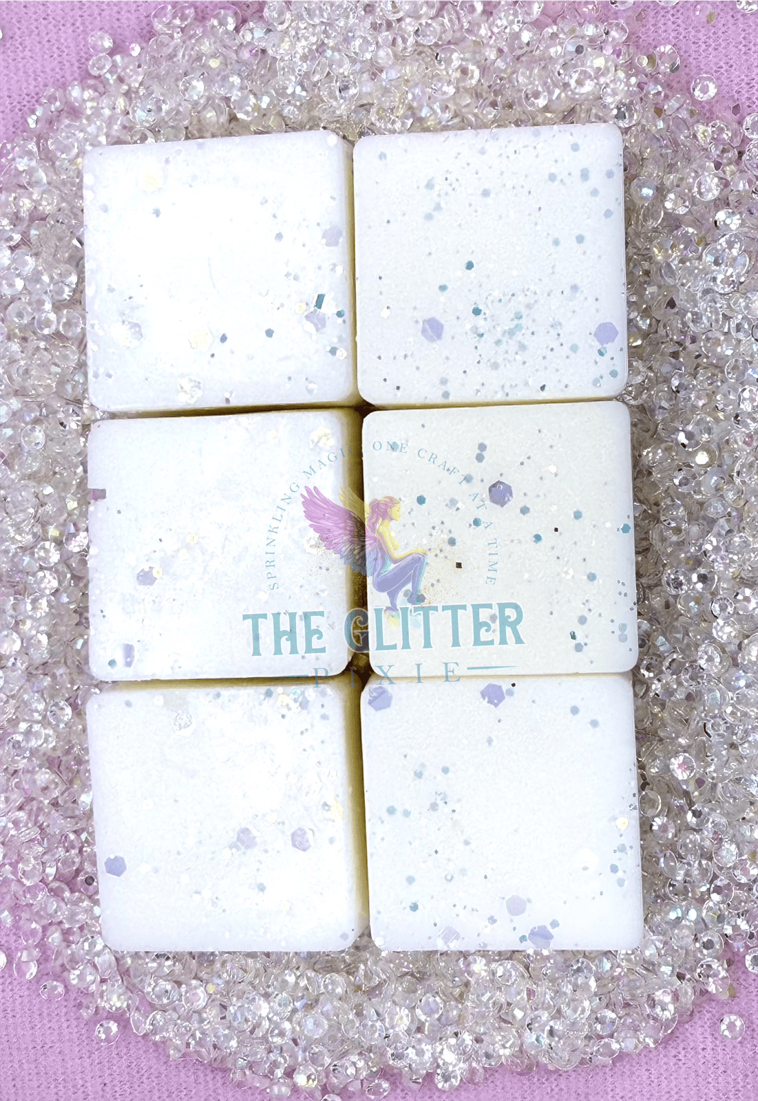 Handmade Sweet Grace wax melts. These are soy wax. They have white mica for that shimmering effect and glitter. You get 6 pieces. The pieces are approximately 1" by 1" by 1/2" big. The weight of all 6 pieces is approximately 2.3 ounces.